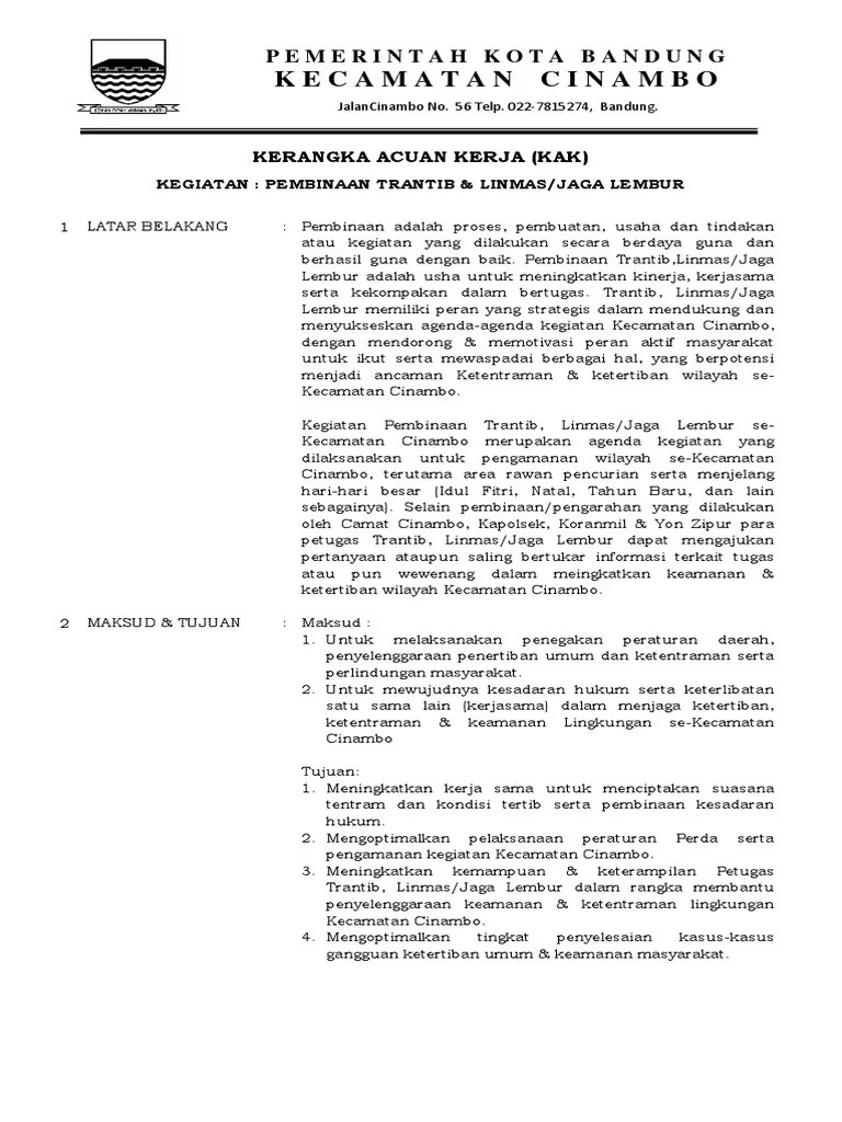 Contoh Format Kerangka Acuan Kerja Kecamatan Di Kota Bandung : Kerangka Acuan Kerja Dau Tambahan Revisi 4 Doc Kerangka Acuan Kerja K A K Term Of Refrence T O R Organisasi Skpd 6 01 01 01 Kelurahan Cipageran Course Hero - Dinas pendidikan dan kebudayaan kabupaten demak.. Kak (kerangka acuan kerja) tahun 2021 . Permasalahan pembangunan, isu strategis, program strategis, kerangka. Dinas pendidikan dan kebudayaan kabupaten demak. Pembuatan rencana kerja pemerintah daerah (rkpd) kota bandung, renstra. Perintah dikeluarkan oleh kepala satuan kerja dalam bentuk surat perintah kerja lembur.